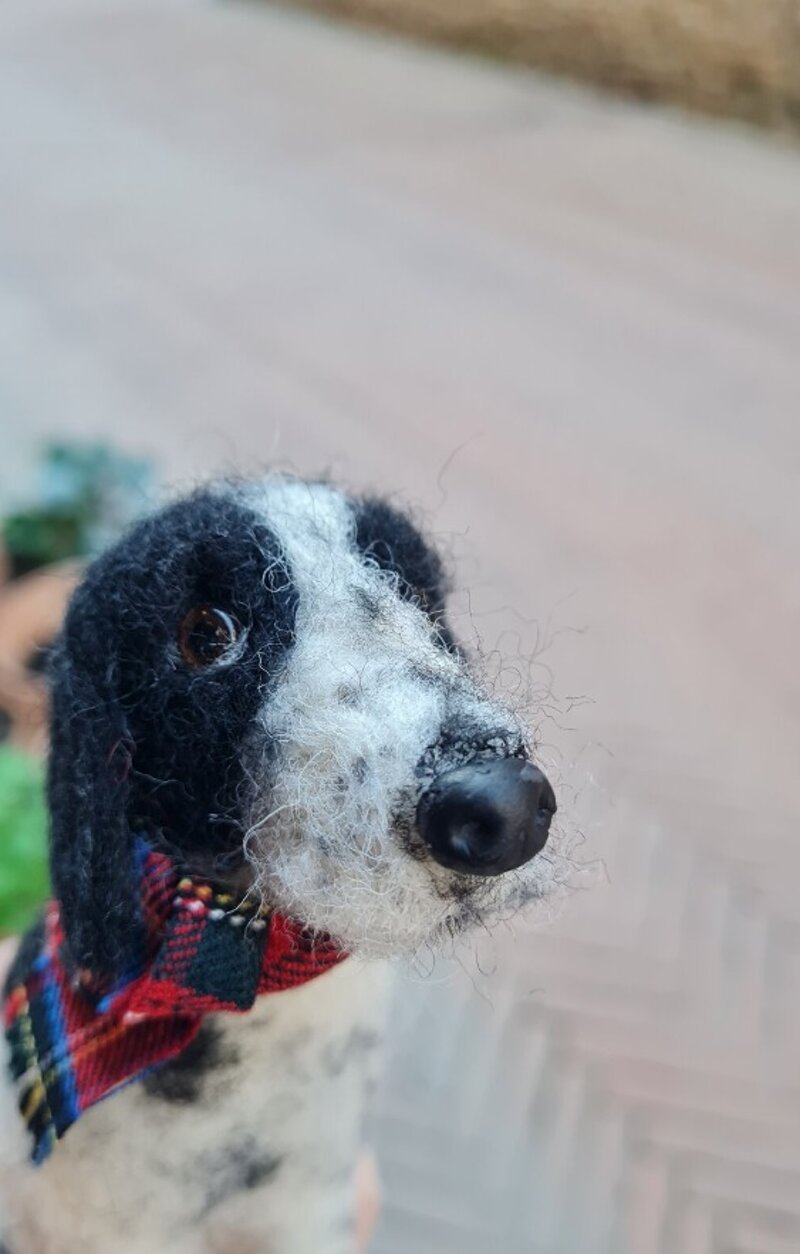 Partendo da fibre di lana lavorate una ad una, la forma è stata costruita lentamente fino a dare vita al corpo, al muso e ai piccoli dettagli che rendono questo cagnolino espressivo e unico. Ogni particolare è stato modellato manualmente con grande attenzione, per creare una piccola scultura dal carattere dolce e realistico.